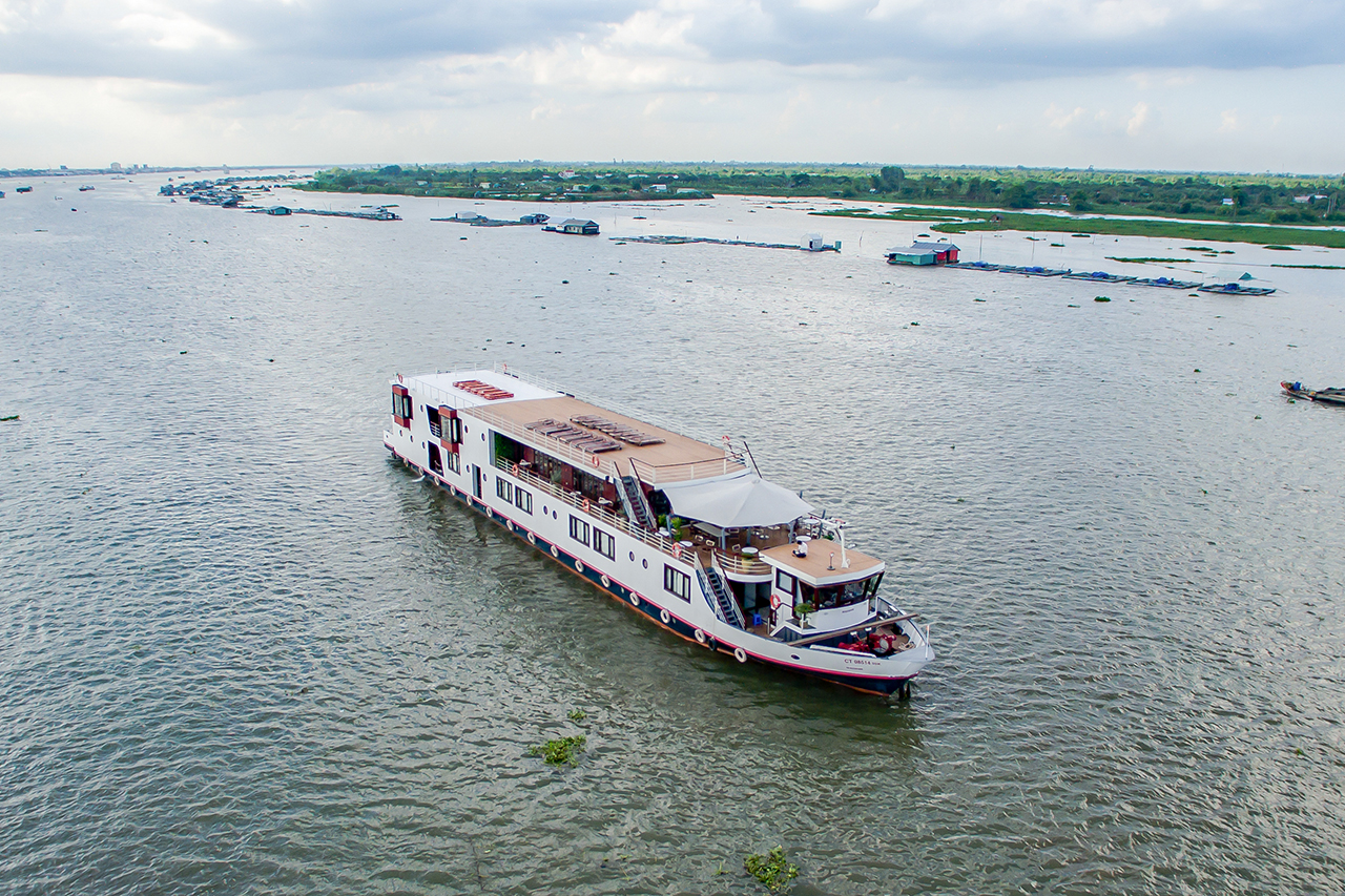 - On the sun deck on the top deck you can enjoy a sun bath while watching the scenery passing by. Indulge in the culinary specialities of Vietnam in the roofed outdoor restaurant or enjoy a sun-downer in your private bar on the top deck — all with fantastic river views.